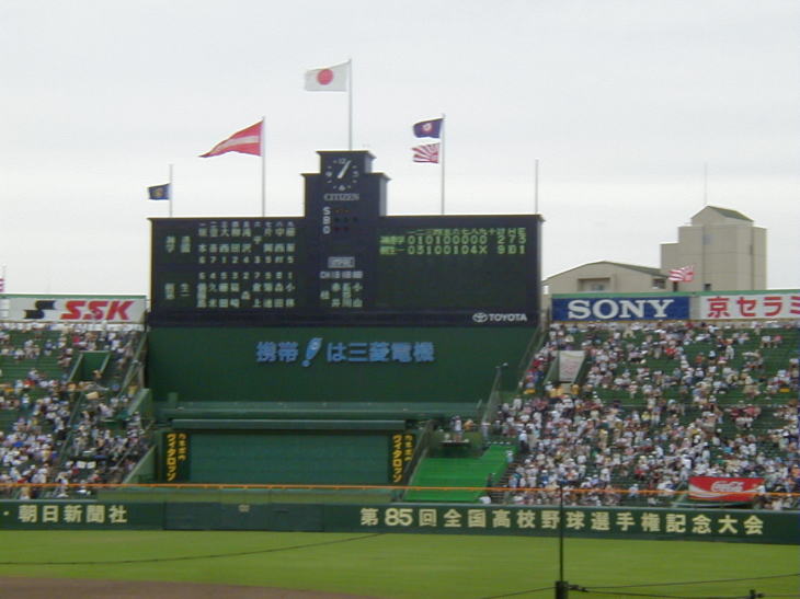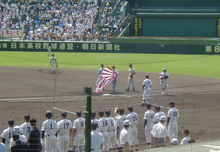主催者の朝日新聞社の旗がスコアーボードの上に掲揚されました。