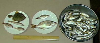 ●釣果 メジナ10cm前後3尾、 アジゴ13cm前後7尾、タイ12cm前後3尾、 カワハギ14cm2尾、 シロギス16cm2尾、 ヒラメ25cm1尾
