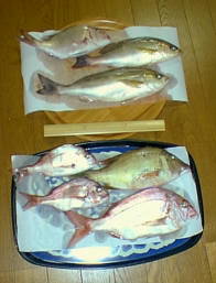 ●釣果 マダイ45cm1尾、 25cm前後3尾、 イサキ33cm1尾、 30cm1尾、 イサキの子(体に縞がある)1尾、 フエフキダイ43cm1尾