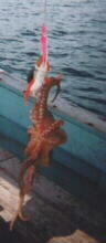 初めてのタコ釣りでした。 底まで餌を下ろし、底をひきずります。 糸が重くなったら一気に引き上げます。 その時あまり強く引っ張るとタコが針から外れてしまいます。 しかけが面白かったです。 母は舟が苦手なのでホテルでお留守番でした。 日焼けも怖いし・・・・・。